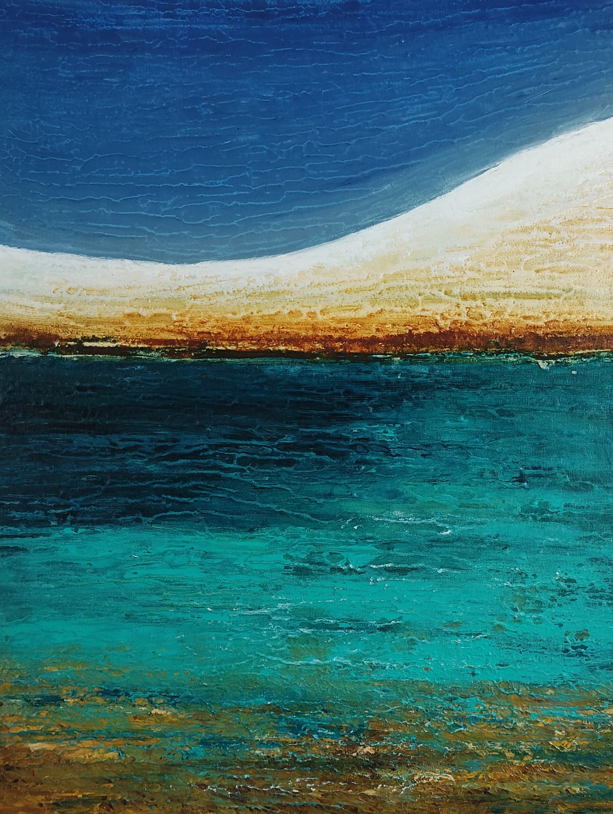 A experiência de vivenciar os Lençóis Maranhenses provocou uma transformação profunda no olhar da artista visual Veni Bernard elevando seu sentido além da paisagem vivida. Diante das dunas de areia com uma cartela de cores suaves entre branco, bege e cinza, lagoas ora em tons de verde esmeralda e do céu intensamente azul e ora com tons variados de verdes, amarelos e brancos com raios de Sol. Fazendo a água se transformar em cores inimagináveis e impossíveis de captar, a artista foi tomada por uma emoção genuína, por meio do estado de contemplação, pela alegria e euforia, por forte sentimento de conexão com a paisagem e consigo mesma, trazendo o Divino para perto de si.