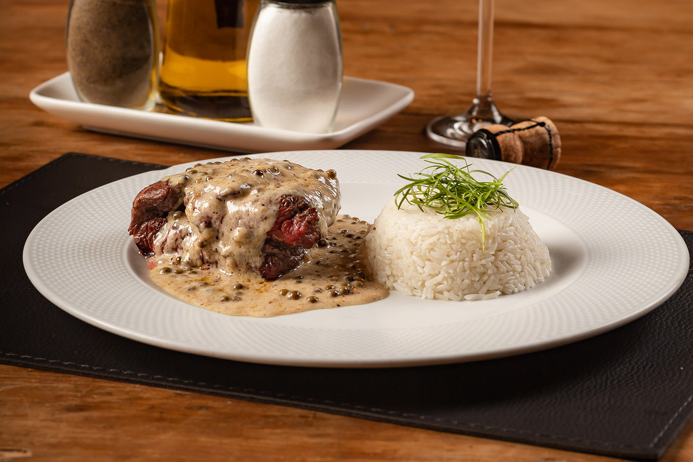Nos pratos principais, há também um que flerta com a cozinha internacional, o Mignon com pimenta verde. Trata-se de um filé Mignon grelhado, acompanhado por arroz branco e molho mediterrâneo, à base de pimentas verdes e especiarias árabes. Custa R$ 89,90 (serve uma pessoa).