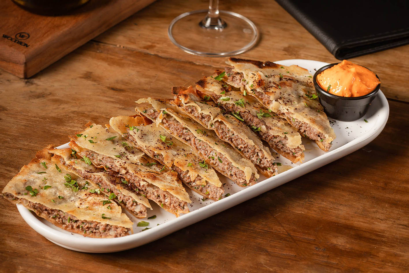 Outra assinatura da casa é a Kafta no pão com queijo. Um dos pratos mais pedidos, apresenta o pão árabe, crocante e fininho, recheado com carne de kafta e queijo mussarela. Chega à mesa servido com pasta de alho picante, finalizada com sumac (especiaria também conhecida como sumagre, extraída de um arbusto) e salsinha em pó. Com oito unidades, custa R$ 39,90.