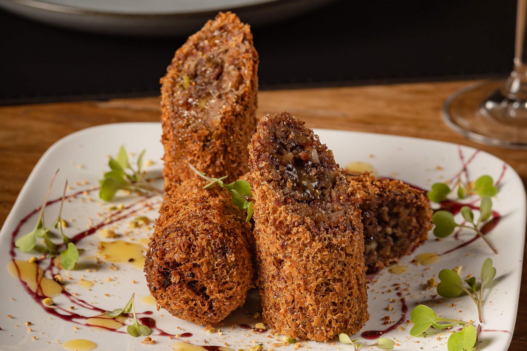 Para deixar isso bem claro, as releituras de pedidas tradicionais vem com um “Le Mir” no final do nome escrito no cardápio. O Kibe frito Le Mir é um bom exemplo. Elaborado com massa artesanal de trigo libanês, leva no recheio carne bovina, pistache, amêndoas e especiarias árabes, finalizado com melaço de romã e pistache triturado. Custa R$ 37,90 com quatro unidades bem “generosas”.