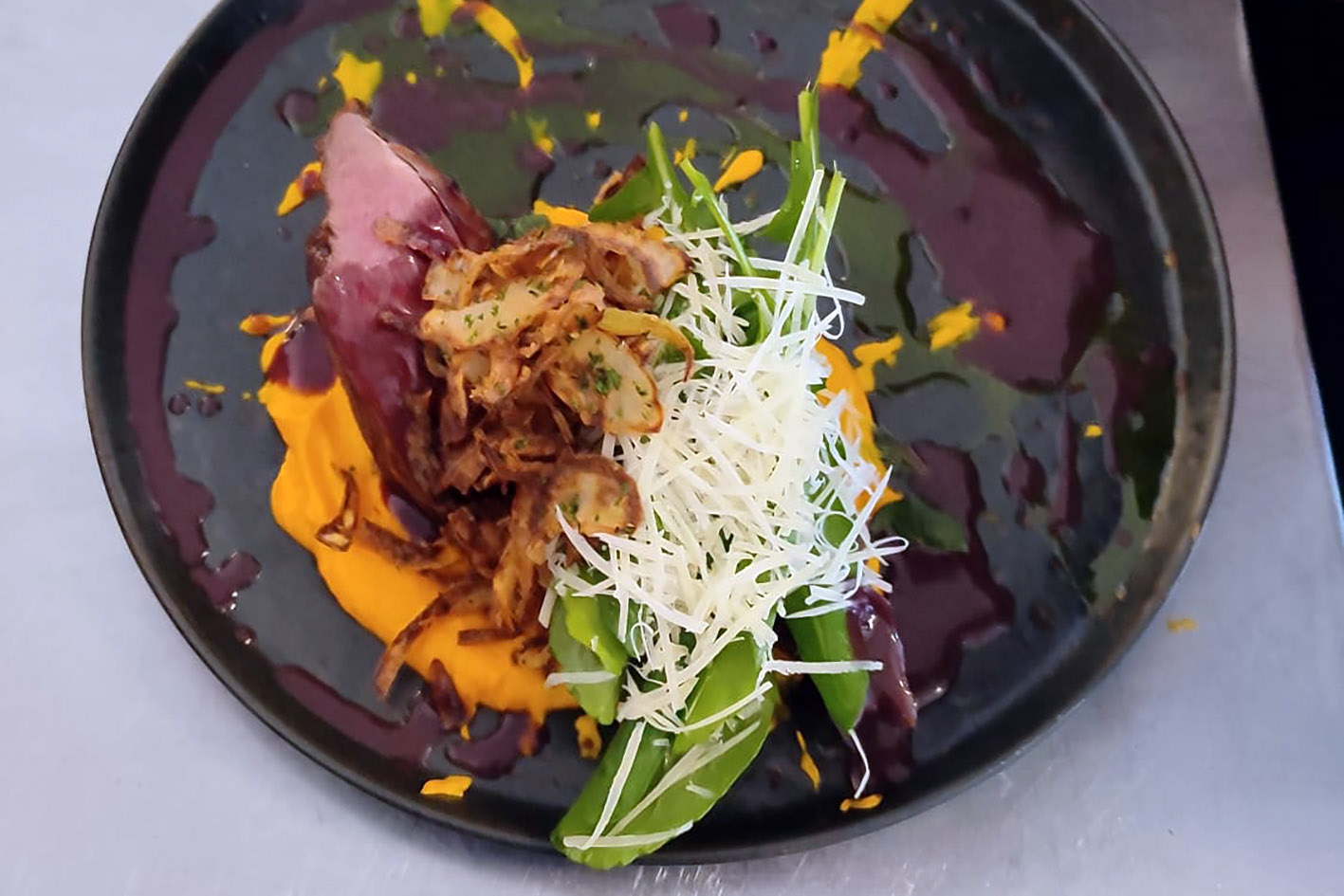 Entre os principais, também são três estreias no menu. O Mignon com aligot e demiglace de cogumelos ressalta o corte bovino nobre com o aligot, um tipo de purê de batata francês muito cremoso com toque generoso de queijos Gouda e parmesão (R$ 105). Já o Peito de pato com purê de cenoura harmoniza o sabor com a maciez no ponto exato da carne, com uma demiglace de amora, rúcula, parmesão e cebola crocante (R$ 108).