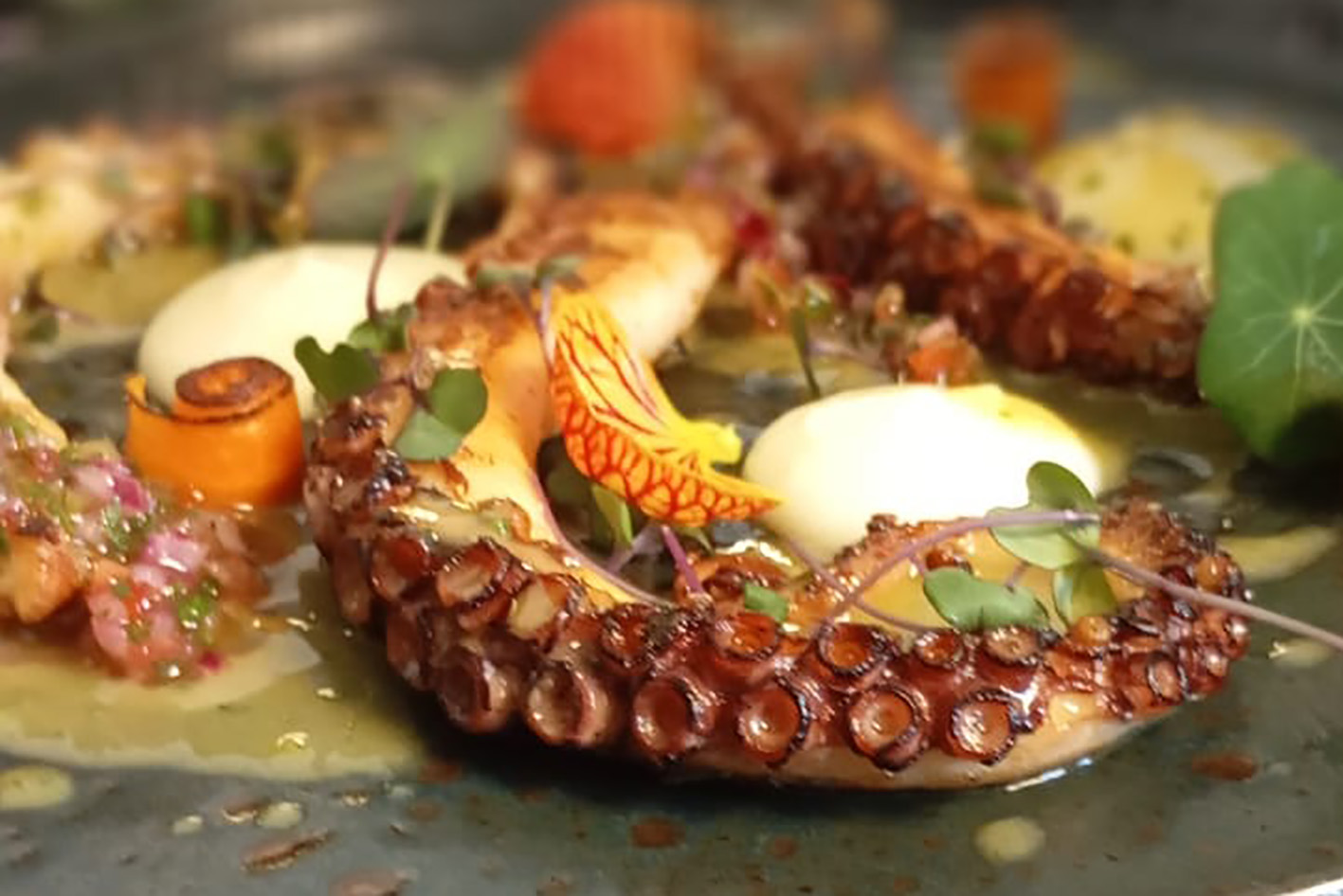 Ingrediente cultuado, o polvo estrela mais um prato novo. É o Polvo grelhado, purê de batata, vinagrete e molho cítrico, à base de vinho branco. Mesclando técnica e sabor, apresenta o molusco em seu esplendor.