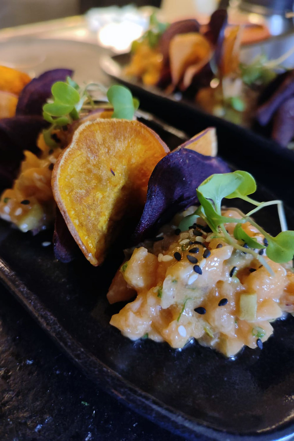 As novidades iniciam pelas entradas, que podem ser compartilhadas para acompanhar os drinks ou ainda marcar o início de um jantar completo. A leveza dos pescados está presente no Tartare de salmão, que traz cubos do nobre peixe temperados com toque cítrico, ervas e especiarias. Para acompanhar, vem com chips de batata-doce, equilibrando textura e sabor – custa R$ 75.